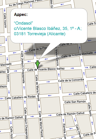 Адрес: c/Vicente Blasco Ibáñez, 35, 1º - A; Torrevieja (Alicante) Телефон: 966 92 77 94 Ответственная за работу сервис-центра Ондасоль: